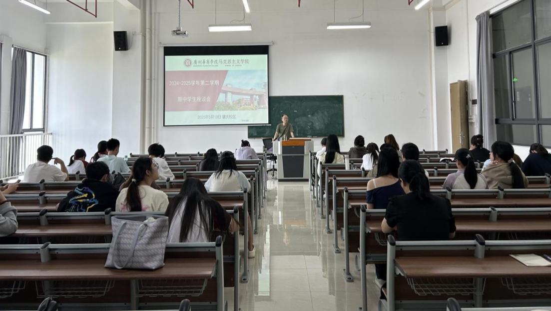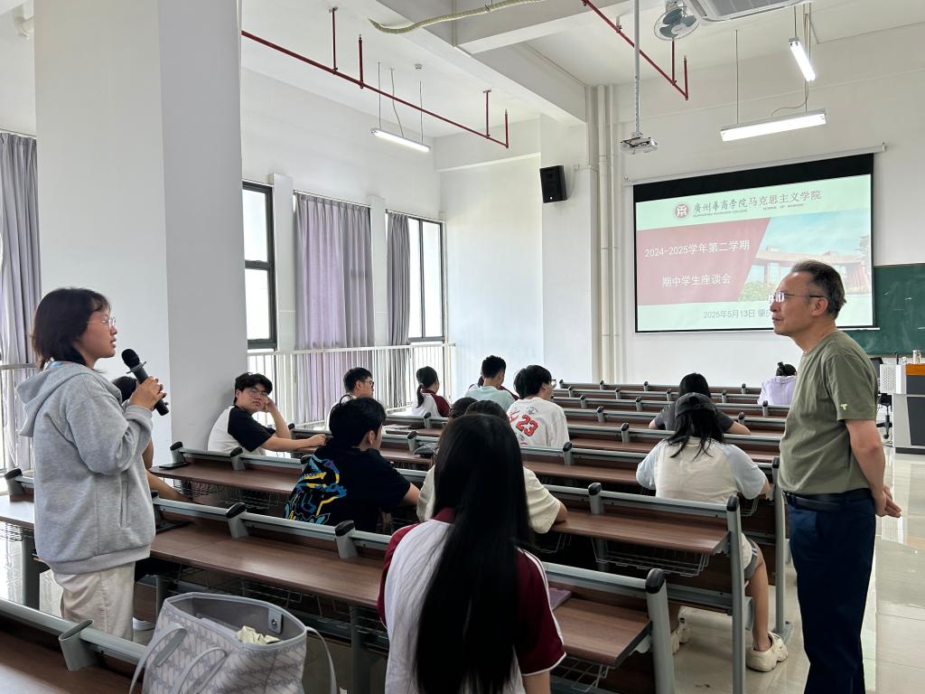 为进一步倾听学生学习思政课的心声,了解学生对思政课教学工作的意见与建议,切实提升思政课的育人实效,国产亚洲精品日日夜夜于2025年5月13日下午在肇庆校区6号楼301教室召开了学生期中座谈会。会议围绕思政课的教学安排、授课方式及实践教学内容设计等方面展开交流,广泛听取学生的反馈与建议。